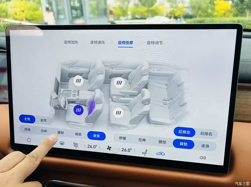 正巧刚刚结束了连着三天的降雨,气温骤降后,座椅加热和方向盘加热带来的优势就不言而喻了,可想而知冬季驾车的时候这个配置简直就是女性司机的福音。除此之外座椅按摩的力度适中可选择按摩部位就有四个,可以很好的缓解长途驾车的疲惫。