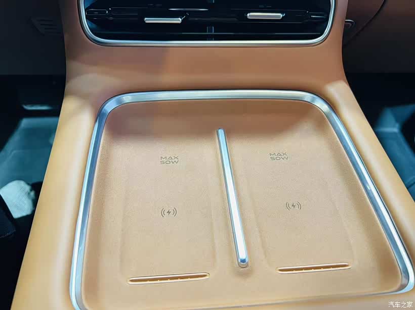 全系标配双50瓦风冷无线充电手机位。可供主副驾驶同时使用内凹与防滑处理,可以更好的避免车辆行驶时手机因滑动造成位移。
