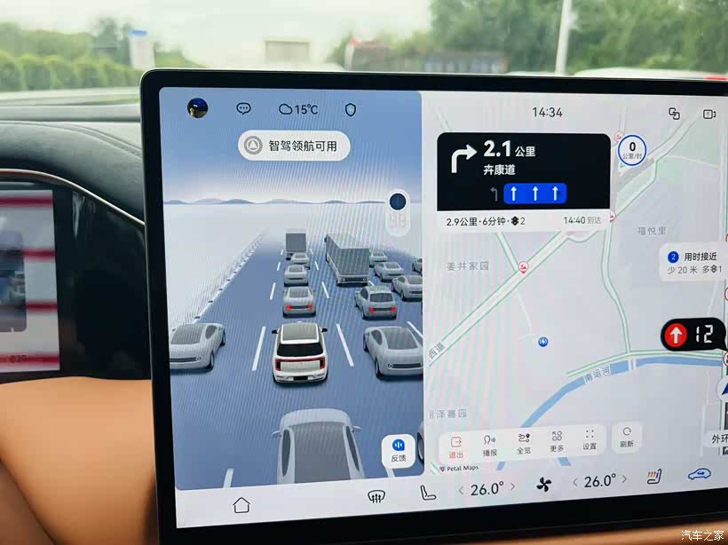 再来说说试驾部分,首先方向盘转向清晰,力度适中。语音识别灵敏,调节车机反应及时。动力输出持续性很好,动力储备充足,超车干脆利落。特地试了减速带,临近减速带时明显感到悬架变软,可以更好地控制颠簸回弹。转弯时悬架变硬获得更好的支撑力让驾驶更有信心。全系标配的抬头显示功能非常清晰,除了导航路线及车速和信号灯提示外还能在转弯时将车辆盲区的实时画面清晰的投射在抬头显示区域。