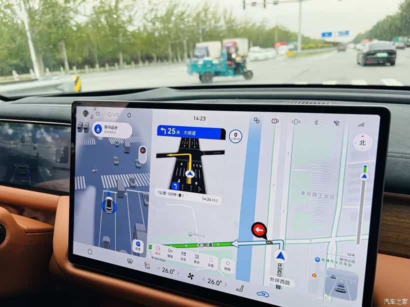 在过路口时前方感知原件也可以清晰扫描到车前方的三轮。