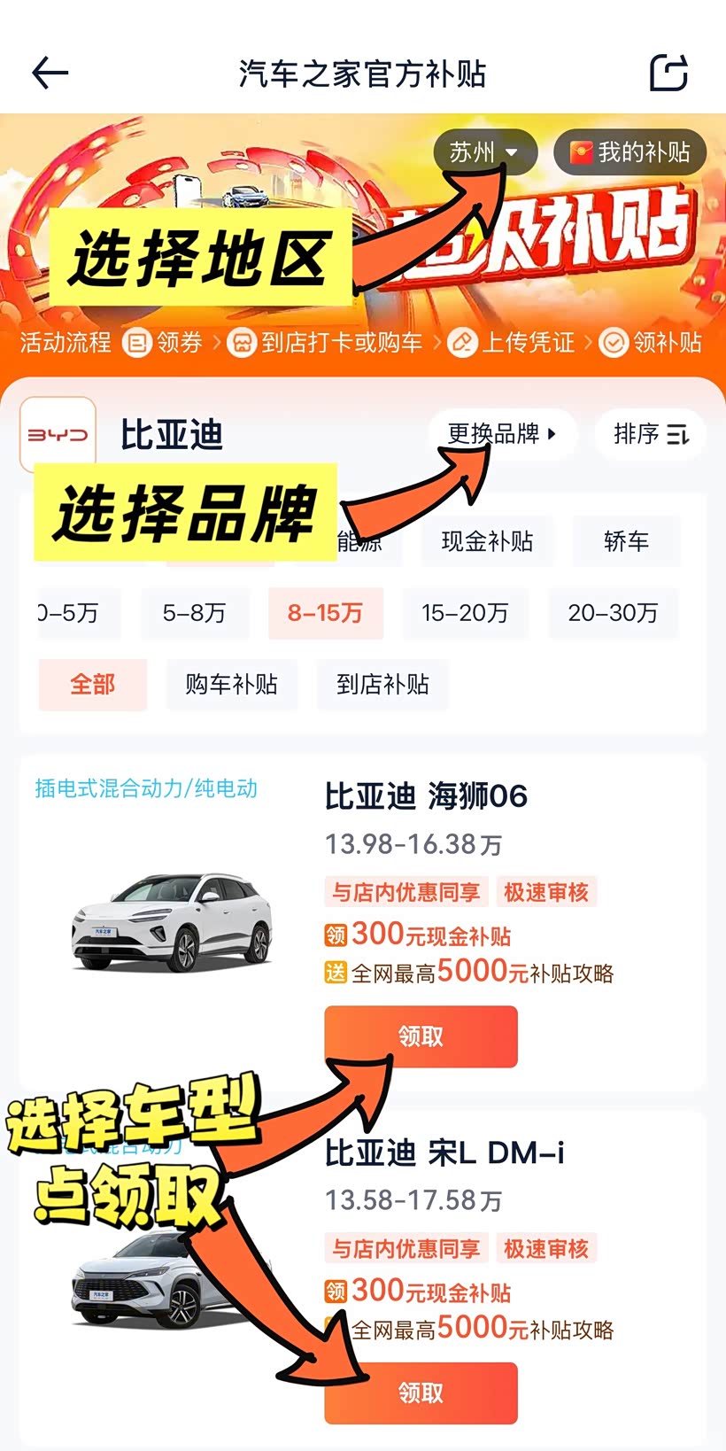 进入补贴页面,选择地区,选择品牌,选择需要的车型,再点击领取进入