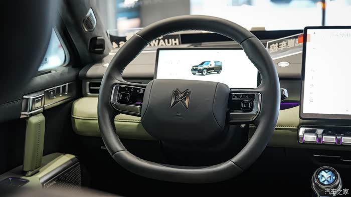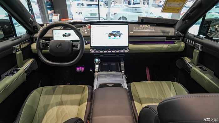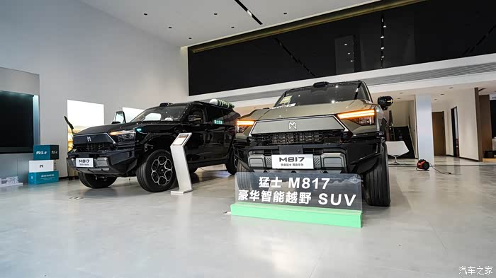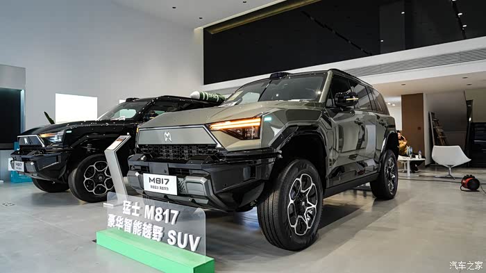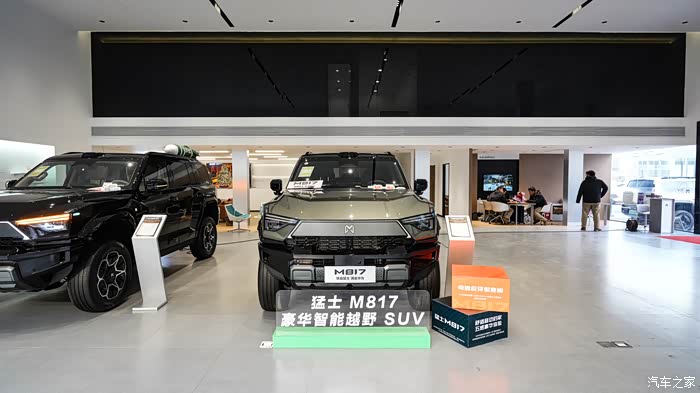 一进店内两辆非常经典的越野配色的猛士M817停在展厅最显眼的位置。这是两辆顶配的车型MAX+版本的