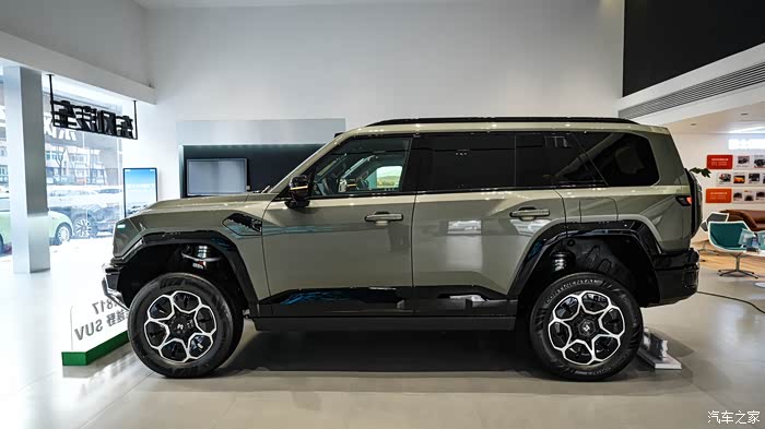 OK下面我们开始正式的探店之旅,首先我们来看外观,猛士M817这个车当时在冬测的时候看着感觉也就还好吧,可能因为冬测场地太大所以显得猛士M817倒是没那么大了,结果现在看来好一个庞然大物,真是又高又大又猛~~ 整个车的棱角很分明让整个车看起来就很硬朗,并且在设计原创度上很高,并且还很科技很好看,看来国产车的审美越来越高了。秦岭绿的车身很有越野氛围,黑色的越野杠也让这车看起来霸气不少,不同型号的保险杠还不一样待会带大家看一下。