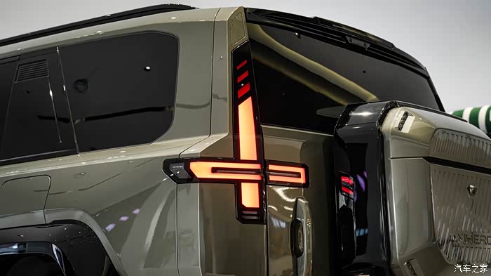 下面我们来看车身,猛士的车身长度达到了5100,轴距也来到了3005,车侧面的姿态很硬派,前轮的接近角很大,前悬很短,整个轮上空间很大,一看就是给改装大脚留出了足够的空间。而且我感觉好像这辆展车把它的空气悬挂调成了最高了,导致后轮的空隙有些奇怪。
