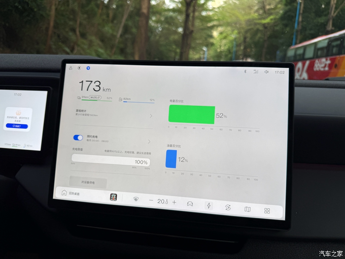 9月底那会儿刚提车,天气热,基本每天都要开空调,我记得最清楚的一次是从家出发去公司,中途接了孩子放学,绕了一点路,那天气温三十五度左右,空调开的二挡风 22度恒温,一共跑了150公里左右,表显还剩下20%的电左右(因为我是开了那个强制保电的,并不会一次性把电全用完),平均电耗差不多16.4度左右,还能接受。