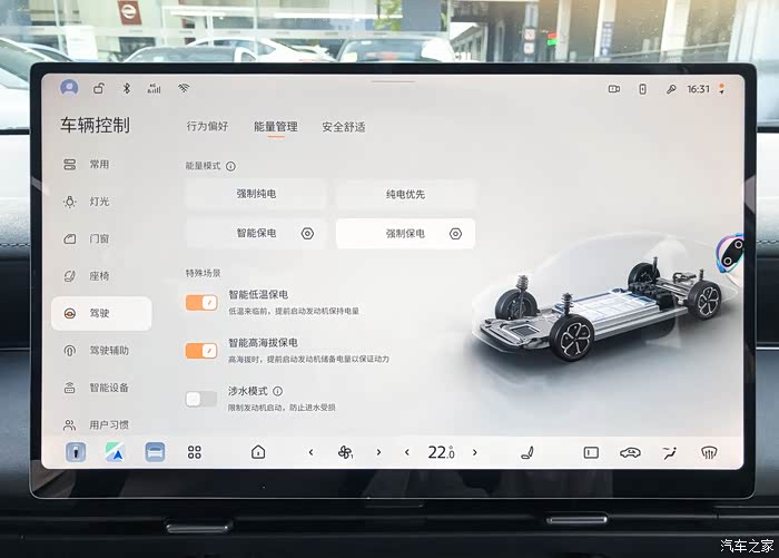 驾驶功能可设置行为偏好、能量管理(强制纯电/纯电优先/智能保电/强制保电)、安全舒适