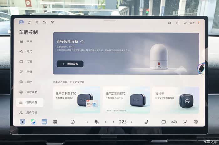 在智能设备方面支持多平台手机互联、可根据自己的需求添加智能设备、包括日产定制的ETC、智控贴等等