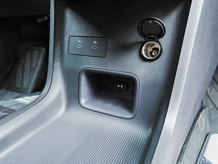 独岛的下方采用镂空设计,可放置大量的随车用品比如:需要跟换的驾驶时备用鞋、雨伞、手袋等等、同时还设计了12V点烟器插口以及C口等充电接口,储物格的底部还进行了条纹纹理设计来增强摩擦力、抗震力!