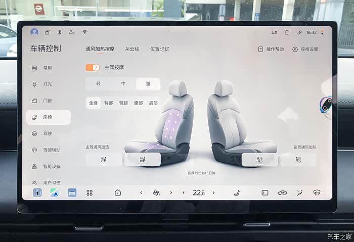 还可以通过大屏设置座椅通风加热按摩功能(可设置全身、局部)、AI云毯、记忆座椅功能