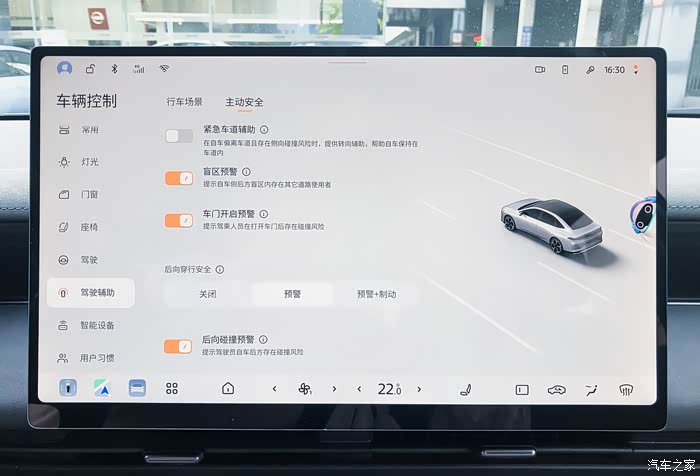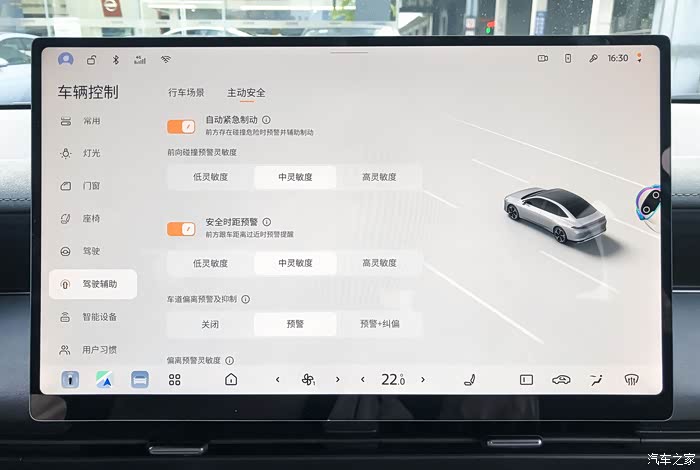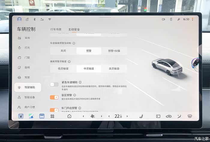 主动安全驾驶辅助设定还包括:车道偏离预警(关闭/预警/预警+纠错)、偏离预警灵敏度设定、紧急车道辅助、盲区预警、车门开启预警等驾驶辅助功能