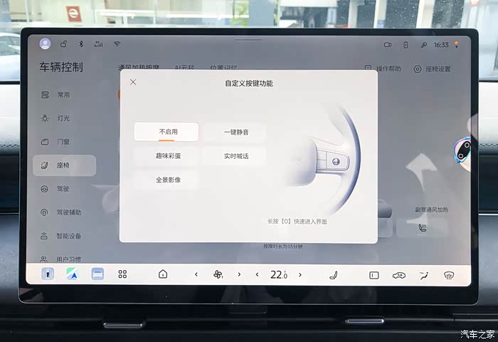 座椅还可以实现方向盘功能键自定义设置:一键静音、实时喊话、趣味彩蛋、全景影像等功能
