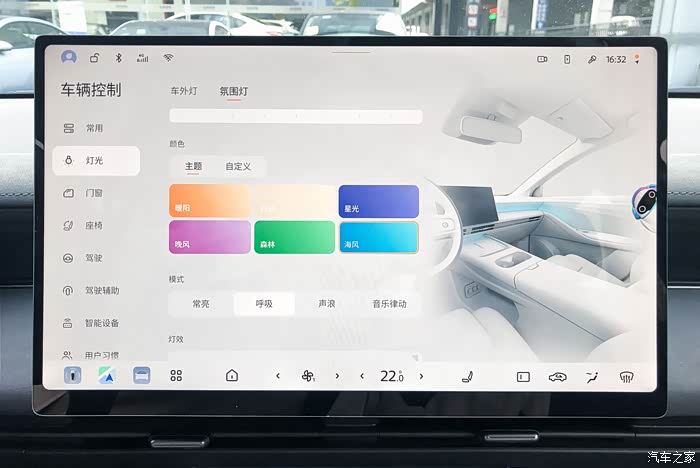 灯光设置包括车外灯设置、氛围灯颜色主题选择(暖阳/星光/晚风/森林/海风)、提供了256色氛围灯、可根据自己的个人喜好自定义。配合整车6扬声器,的确能营造属于个人的浪漫氛围!