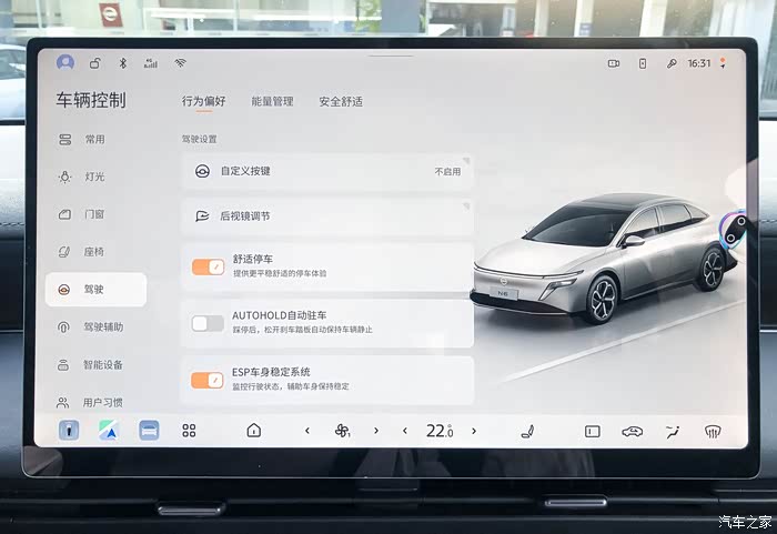 行为偏好驾驶设置:自定义按键、后视镜调节、舒适停车、AUTOHOLD自动驻车、ESP车身稳定系统等功能设定