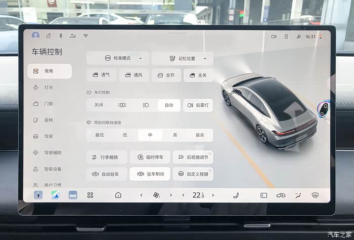 车辆控制常用功能:车灯控制、雨刮间歇档速度、、行李箱锁、驻车制动、后视镜调节、自动驻车、临时停车、自定义按键等都可以在中控大屏上操作设置完成