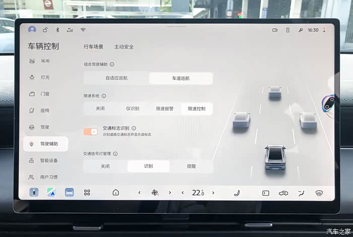 行车场景包括综合驾驶辅助(自适应巡航/车道巡航)、限速系统(关闭/仅识别/限速报警/限速控制)、交通标志识别、交通信号灯管理(关闭/识别/提醒)等驾驶辅助功能