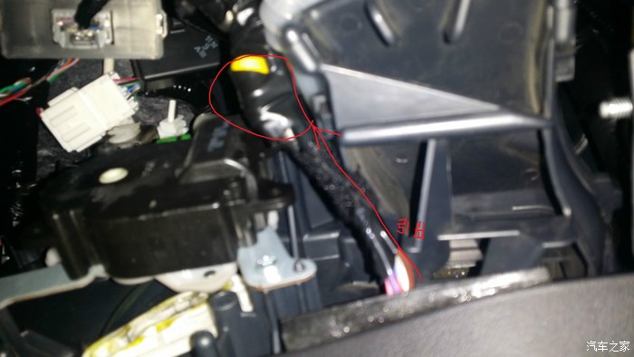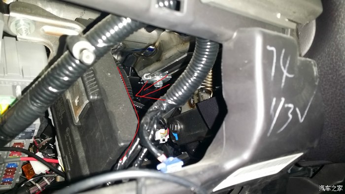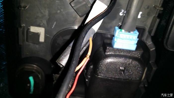 另外要注意的是所有的输入输出插头,都要引到方向盘下一个可靠位置,以后增加或者替换什么的时候,可以不用拆中控了。(红色线是引出的AV线等,一根连接倒车后视镜,其他的包起来固定在方向盘下是钢管上,备用)