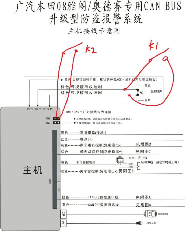 考虑到后视镜并不是每次锁车都需要折叠的,所以加了一个控制是不是自动折叠后视镜的开关(直径16mm单刀自锁按钮开关,高平头,接通平,断开凸起)。采用连接见下图K1,K1合闭时不自动折叠后视镜。(产品是在延时期断开该电路,实现折叠后视镜的,将其短路,则自动折叠功能失效。)
