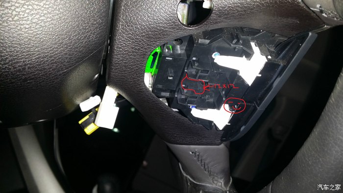 打开方向盘蓝牙按钮后罩,你会惊喜的发现红色位置简直就是给微动开关留的位置,12*12微动开关,用小刀去掉两个芝麻大的凸起,12*12微动开关完美放入,不大不小刚刚好