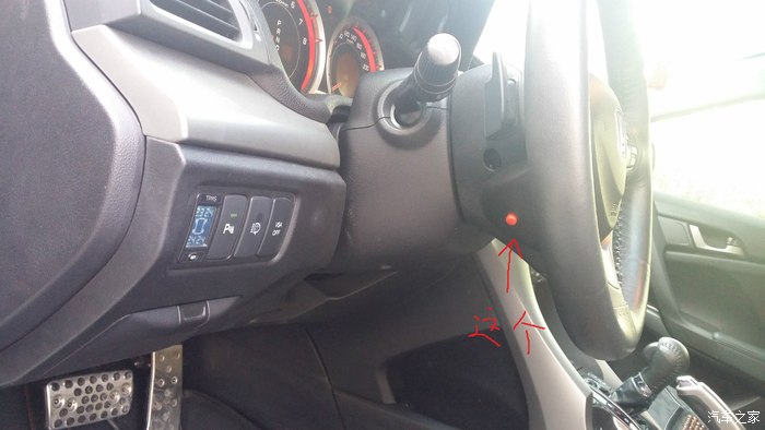 主机安装在方向盘下,定速巡航控制板上,用双面胶粘上,然后稍微扎丝固定一下就行。如图位置:
