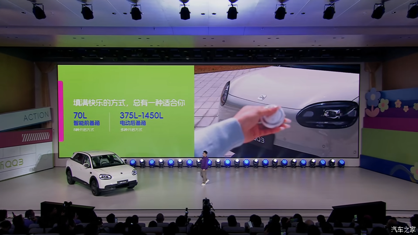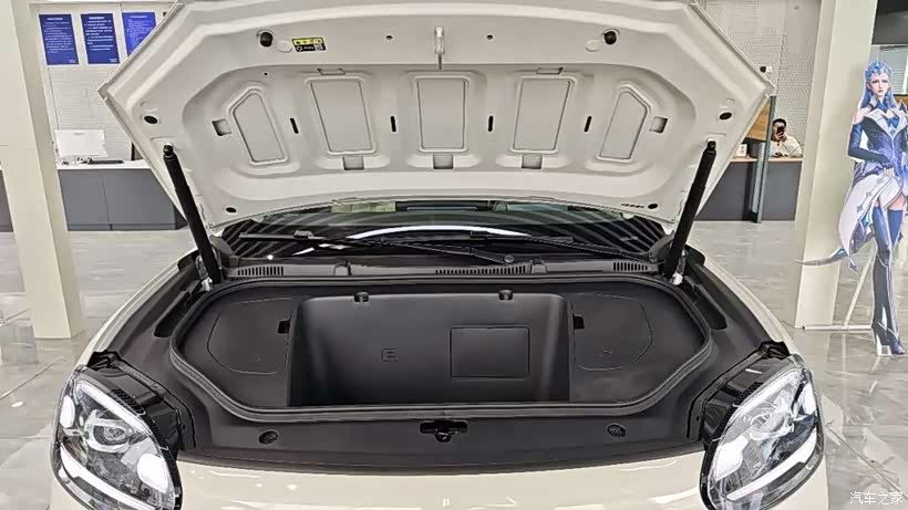 前备箱的容积达到了70L(和星愿一样),内部方方正正,边缘甚至还带两个挂钩,实用性好强。这里有一个很有趣的细节信息,QQ3官方标注后备箱容积和星愿完全一样,都是375L,但我在现场看到的后备箱并没有下沉空间,也就是说,QQ3利用更大的进深空间和纵向空间做到了星愿加上下沉空间之后的容积总和。