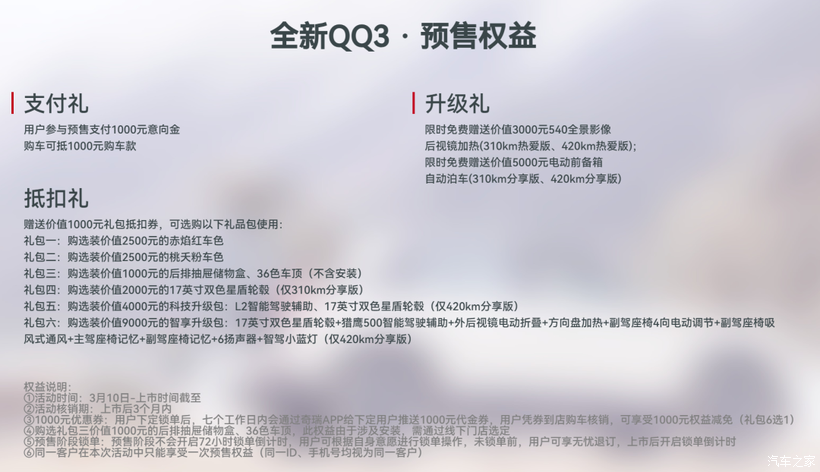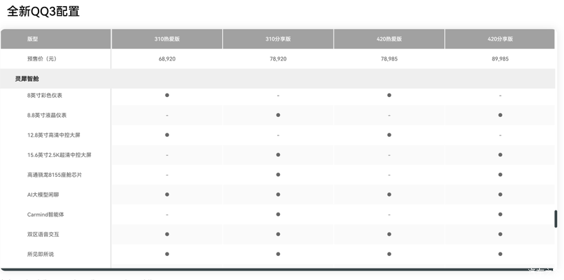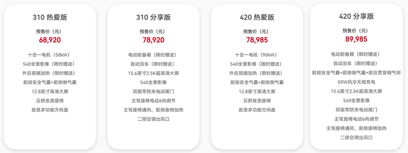照例在结尾这部分我们要聊聊权益和定价,说实话我看不太懂奇瑞是怎么想的,在预售价出来的时候我人都看懵了,四个车型分别定价310热爱版68920元、310分享版78920元、420热爱版78985元,420分享版89985元,这咋还有零有整的?这价格定的是为了锻炼终端销售们的记忆力吗?