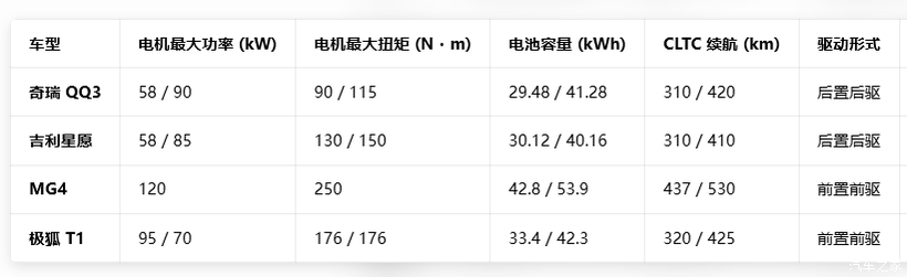 难得的是,QQ3这次也算下了血本,连后驱+独立悬架都追上了星愿,总算在纸面参数上比MG4和极狐T1更加“先进”了。但话要说回来,极狐T1我没动态试驾过,表现如何不好说,MG4的动态实际表现由于更强的动力和更好的底盘调教加持下,其实是反杀星愿的后驱+独悬组合的。至于QQ3,还需要等试驾车到店以后动态体验了才能下结论。