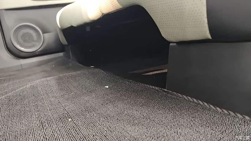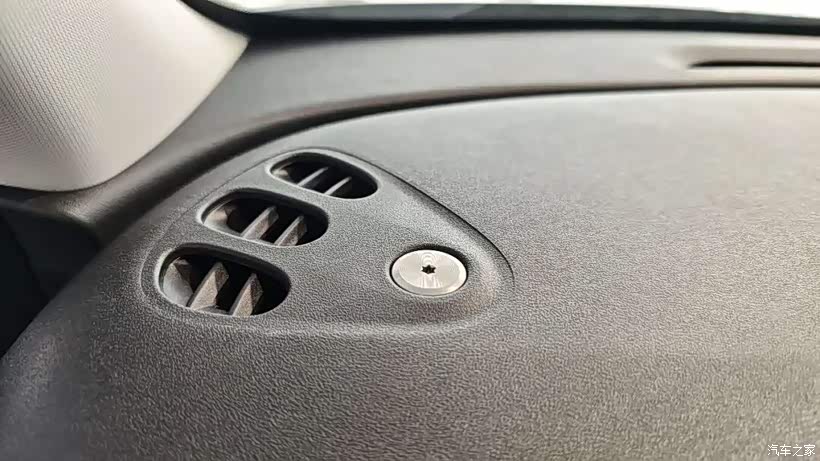 但回到现实的“买家秀”里,打孔纹理却不见了。当然,我不是说这个价位一定有必要上这么复杂的纹理,但既然你实车上没有的东西,宣传图里是不是就不应该出现?相似的问题还出现在A柱音响罩上,宣传图里金属质感的音响罩在实车上也是没有的。顺便再吐槽一下这个车标,是真的不好看,仪表台上方区域和星愿一样都是硬塑料。