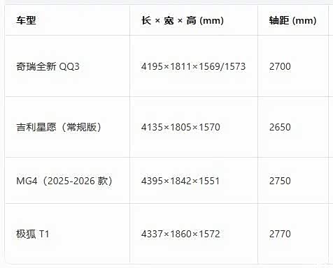 奇瑞QQ3车身尺寸4195x1811x1569mm,轴距2700mm,420km续航的车型会更高一点,到了1573mm。整体尺寸其实没比吉利星愿大多少,有的垂媒上定位是紧凑型车,有的则是小型车,这点咱们先不管。空间上相比星愿,QQ3轴距略有优势,但比起MG4和极狐T1,优势又没了,空间的实际表现我们留着后面细说。