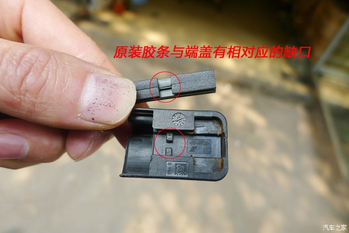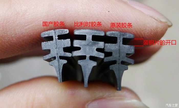 原装雨刷钢片比市场上面的国产雨刷用的钢片要厚,胶条上面装钢片的开口比较宽,经过安装实测,比利时进口胶条很轻松就能完美装上使用,国产胶条由于装钢片的开口宽度少于钢片厚度,装上太紧,完全是挤进去的,不完全匹配安装也麻烦。