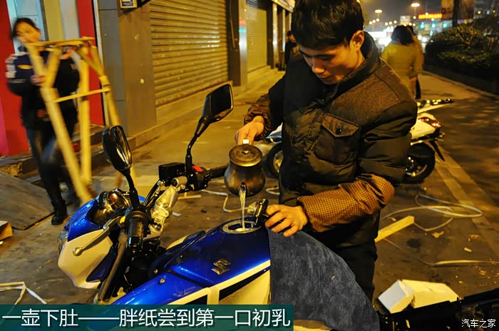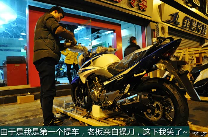 顺便店里逛逛,有部蓝白F版,金属漆真特么亮,有明显的金属颗粒(云母),漆水没得说(订蓝白炫动版只在马路上隔窗看过一次,看来选它选对了),坐姿非常舒适,人坐上去相当舒展,全无CB190的紧迫感。递给老板两支烟,两人聊的比较投机,也问了几个不痛不痒的问题(诸如链条噪音大,加装尾箱&边箱会导致车把摆动呀,都等到一一答复),并送了免费保养&原厂护杠,南京市区牌照为2.3万,承诺当面开箱验货装车,然后交店家上牌。