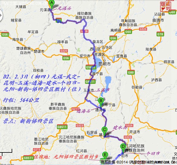 D2、2月3日(初四)元谋-武定-昆明-玉溪市-通海-建水-鸡街-个旧市-元阳-新街-