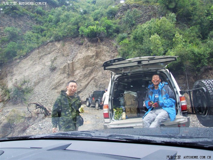 前面不远硬派车队停了下来,心想会不会是车子出什么问题,近前才知是两辆硬派下河滩玩起了极限越野,在这无法超车的道路上,后车只有相随而行。舵主他们顺便将车停在车队后面稍作休息。靠近后见舵主和团长吃着在腾冲路上买的半生不熟的香蕉,一脸的阳光灿烂顿时舒缓了我紧绷的神经。
