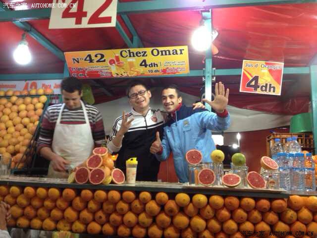 言归正传,我们从大巴下来后,对这个广场大为改观,女同胞更加流连忘返,因为这里是在太多各色各样的工艺品,木刻,服装,还有极具*伯特色的地毯,另外干果,食品,饮料,恨不得逐一尝试,更可恨的是我穿着阿森纳的外套在广场游走,一个卖果汁的小伙子突然给我抵来一杯鲜橙汁,然后指着他的外套,说出简单的两个英文单词“Six,three!”,我细看才发现他的外套是曼城的外套,他在友善的跟我开玩笑,告诉我,曼城昨天6-3击败了阿森纳,我和同伴一口气喝完了3杯鲜橙汁,味道极为可口,4迪拉姆一杯,超值,然后我也作为英超联赛的“loser”,和这位曼城球迷合影,虽然他不太懂英文,我不懂法文,但在次证明,有足球,就有共同语言。由于自由活动的时间只有一个半小时,我们都依依不舍离开,回到大巴,准备前往酒店,只能跟导游说,明天我们还要来这里,我们没逛够。