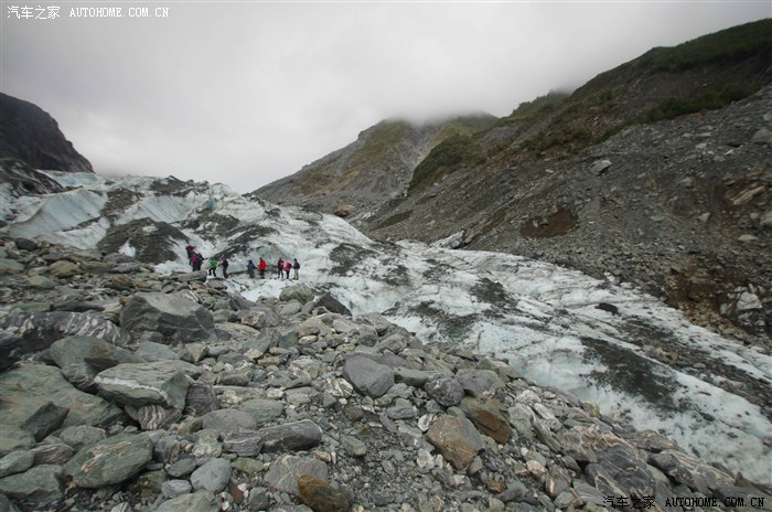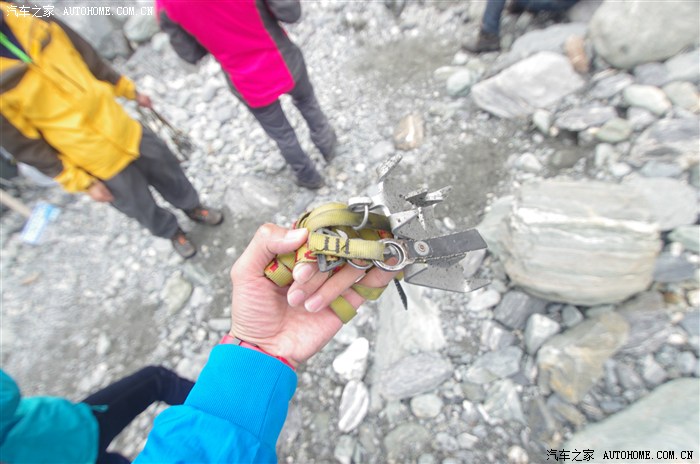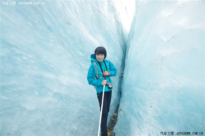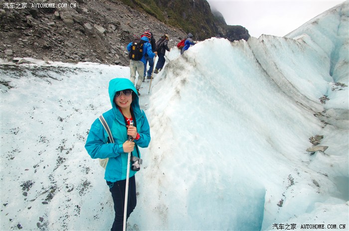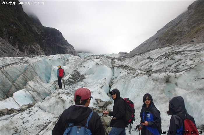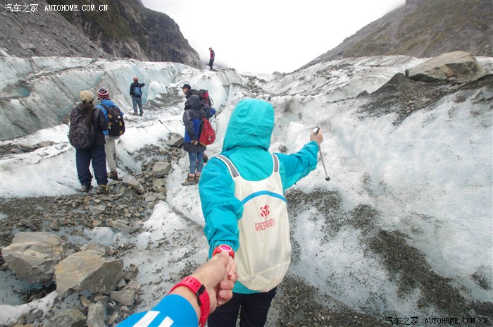 今天要去到FOX冰川,计划乘直升机飞到冰川加徒步,可惜天公不作美,因为风大直升机无法起飞,所以改成徒步。说是山顶冰川实际海拔并不高,SUNTTO显示大约海拔900米就到了冰川脚下,一眼望上去确实很壮观。要在这个巨大的冰川徒步可不是简单事,在随行导游的指导下,我们穿上专用靴子,并且要使用这个专用脚蹬,导游前方铁镐开路,我们紧随其后登上了这座千年不化冰川。冰川的冰块白中透着蓝色,而且很多裂缝深不见底,确实有些吓人,随手凿下一块冰块尝一尝,卡嘣脆。