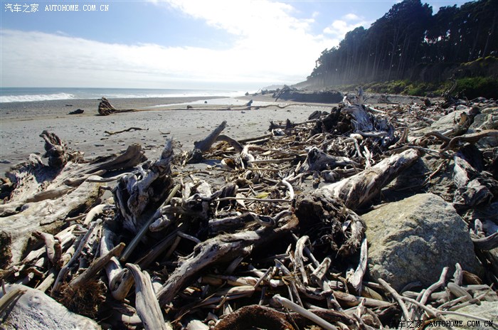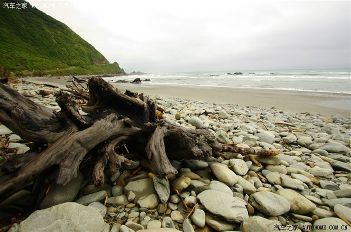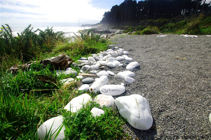 伴随着后备箱啤酒瓶的叮当声,我们驶离福克斯冰川,不久就遇到了两个很漂亮的海湾,名字记不得了,其中一个散布着圆润洁白的石头,好多人在石头上写了寄语放在岸边,不知道看不看得到中文的许愿呀