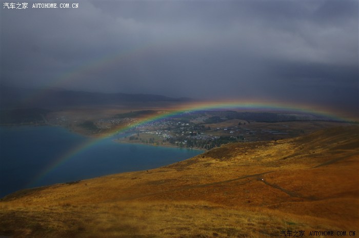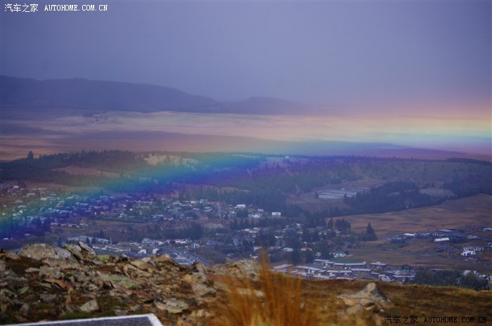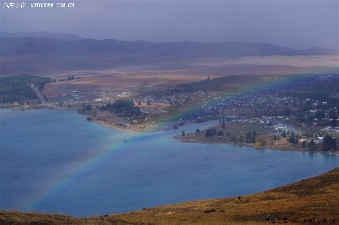 中午决定到湖边Mt John山上一所很出名的咖啡馆吃午饭,顺便拍拍湖景,没想到天不遂人愿,刚到餐厅就赶上迎头大雨,看来山上观湖的节目没法完成了。正在沮丧之时山顶突然出现一道彩虹,哈哈,来一个彩虹中的蒂卡波是不是别有味道呀