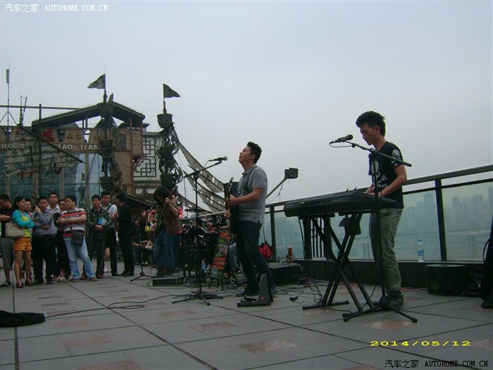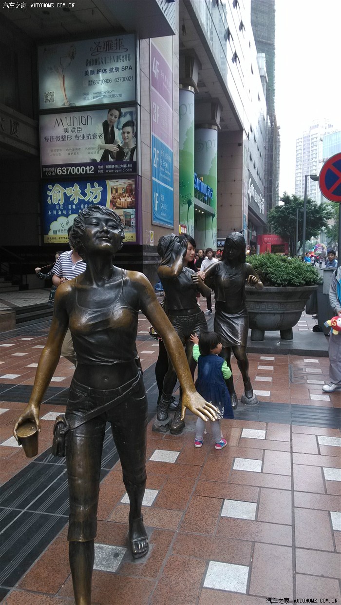 我们在朝天门看了看照了相,又吃所谓的刀削面,每人6元。太辣没法吃。下午去洪崖洞。这里原来是个购物的大楼。有十一层, 电梯可上到九层。我到九层观光,他们三人从三层转上来。我们一起从九楼坐滾动电梯上到十一层,这里竟然是大马路!这就是山城的魅力。老婆与小焦从这里步行到解放碑。我和江哥在等待,观看了4个年轻人在搖滾卖艺。