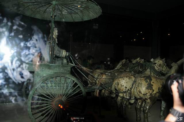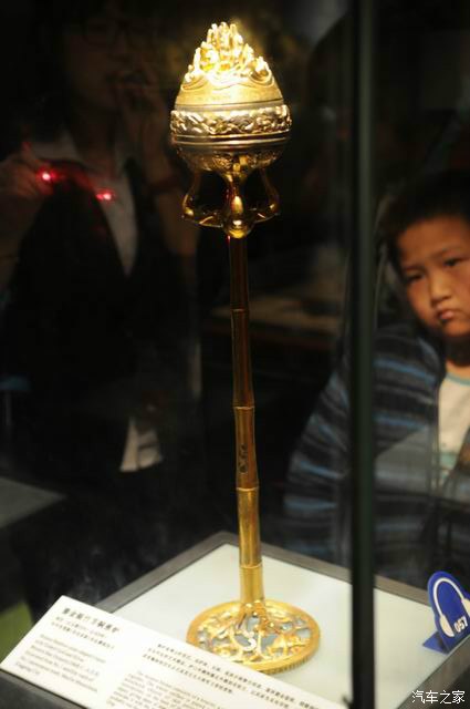 战车大小是实际比例的一半,第1辆相当于现在的开道车,是真品。伞盖既是盾牌,伞顶又有隐藏的长矛,攻守兼备。把伞拿下,还有专门的架子,是历史上第1个遮阳伞!
