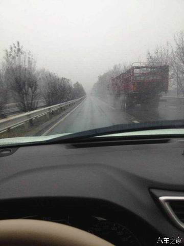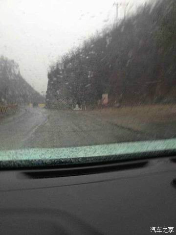 这路完全不是高速那样舒服,弯弯曲曲,上下颠簸,前边有个越野e族的,同是suv就跟他吧,反正肯定甩不掉我!这时雨开始大了!细细看这那是雨啊,明显是雪啊!这图根本看不出效果。