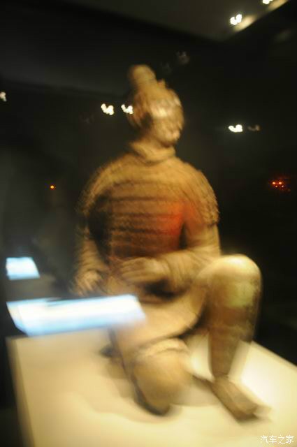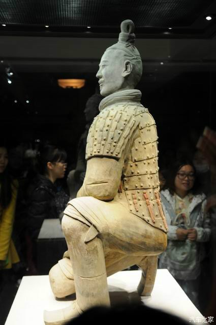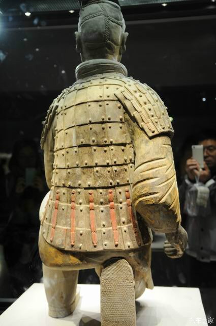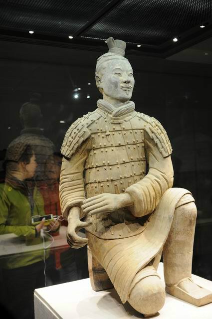 这个是跪射俑,是国宝级文物,陕西形象大使。是唯一一个完好发掘的兵俑。眼睛,手指,指甲,手纹,头发,盔甲纹路都清晰可见。后边还有保留的一些颜色,千层底的鞋底!