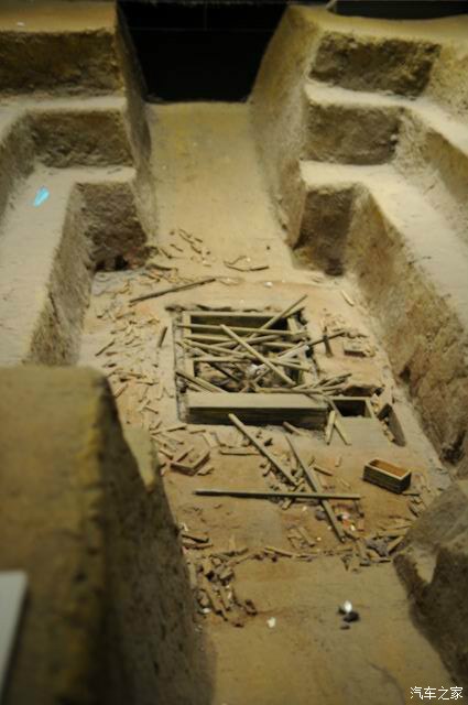 这是一个墓室,里边已经被盗。有270多个盗墓口,但仍出土大量文物,里边既是最小的木桩也有一间屋子高!一人多粗!