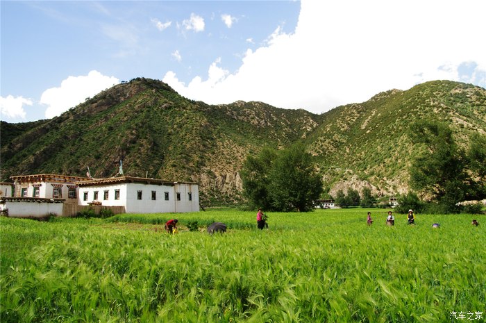 下山途中经过一片农田,老乡们在青稞地里忙活,见到我们这些不速之客的到来,纷纷露出笑容,我们也欣然给小家伙们分发了糖果