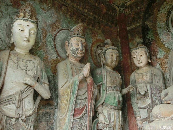 麦积山石窟位于天水东南部,全国重点文物保护单位,与敦煌莫高窟、龙门石窟、云冈石窟并称为中国四大石窟,以精美的泥塑艺术,险峻的洞窟著称于世,是闻名世界的艺术宝库,被誉为“东方雕塑馆”。麦积山因该山状如堆积的麦垛而得名,石窟始建于一千五百多年前,大多在二十至八十公尺高的悬崖峭壁上开凿,层层相叠,密如蜂巢。各洞窟之间有栈道相连,攀援而上可达山顶。山峰的西南面为悬崖峭壁,石窟就开凿在峭壁上,有的距山基二三十米,有的达七八十米。在如此陡峻的悬崖上开凿成百上千的洞窟和佛像,在中国的石窟中是罕见的。石窟周围风景秀丽,山峦上密布着翠柏苍松,野花茂草。攀上山顶,极目远望,四面全是郁郁葱葱的青山,只见千山万壑,重峦叠嶂,青松似海,云雾阵阵,在中国的著名石窟中,自然景色以麦积山为最佳。
