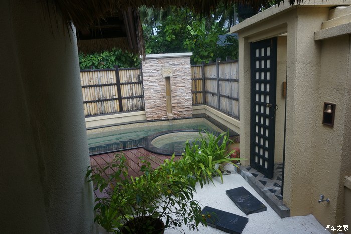 这个是我们的房间 不是很大 但是很温馨 有一个小的泳池 水果跟葡萄酒就是我们的蜜月套餐~坑爹
