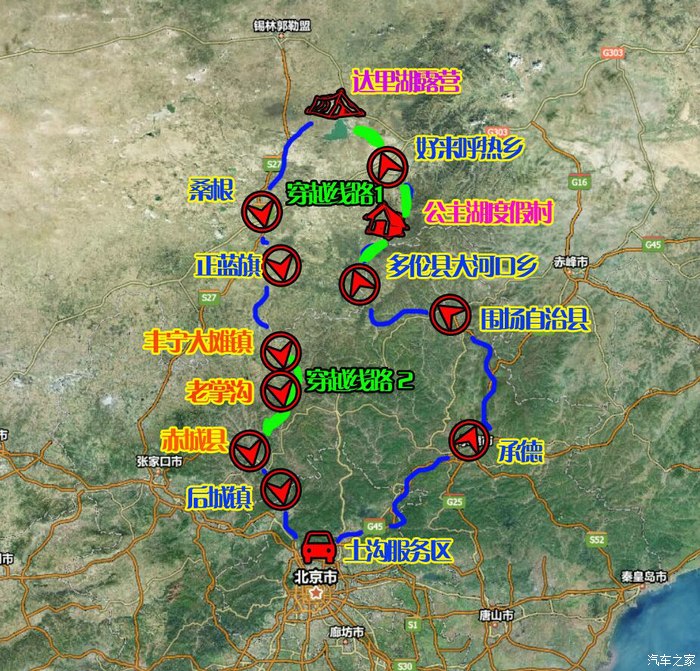 3、第三天(6月22日),达里湖——灰腾梁(沿207国道)——正蓝旗——丰宁县大滩镇——孤石军马场——传奇山庄——老掌沟——老掌沟村口——后城镇——延庆县——北京。穿越线路:传奇山庄——老掌沟村口,里程50km左右,难度较大,最后一天有5辆车穿越老掌沟好汉坡并完好无损安全返回北京。
