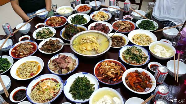 等着我们,我们一到就直接被接着去了青城山下的一个农家乐,迎接我们的是一桌特色佳肴、当地美酒和啤酒。酒足饭
