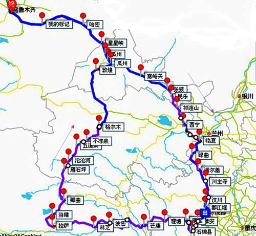 乌鲁木齐—张掖—西宁—赣南—若尔盖—川主寺—九寨—川主寺—都江堰—雅安—石棉—泸定—康定—新都桥—理