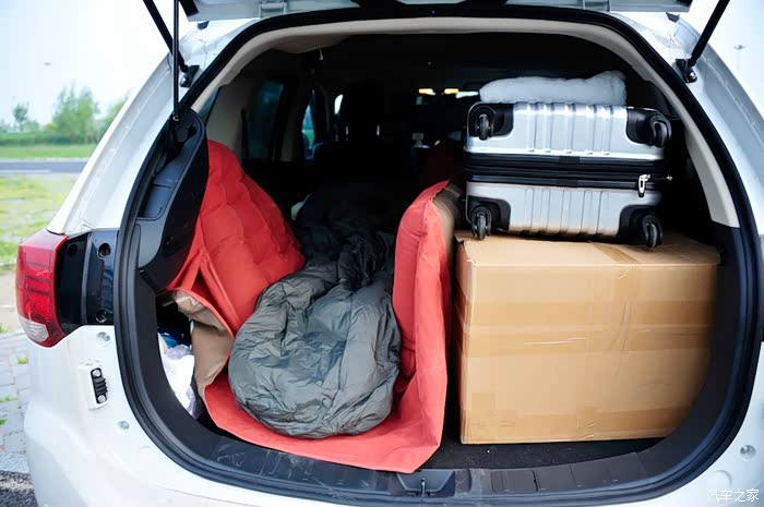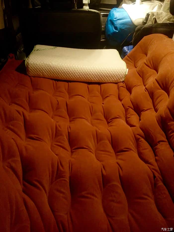 把后排座位放倒两个,箱子移到前面座位和另外一侧,然后用车载充气泵把床垫充好气,嗯!不错,窝终于搞好了,看起来还不错。