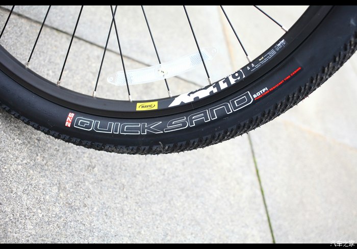 喜马诺QUICKSANO 27.5*2.0的轮胎,此款轮胎胎纹细滑,属于中性胎,公路胎噪还算好,虽然是2.0的宽度,但阻力不大。