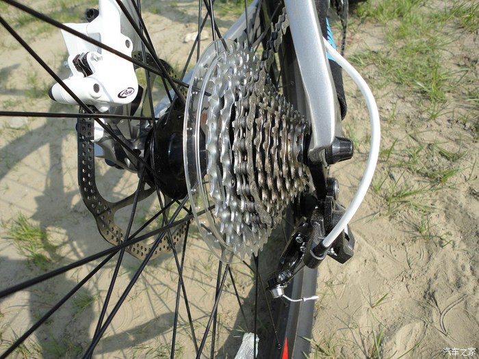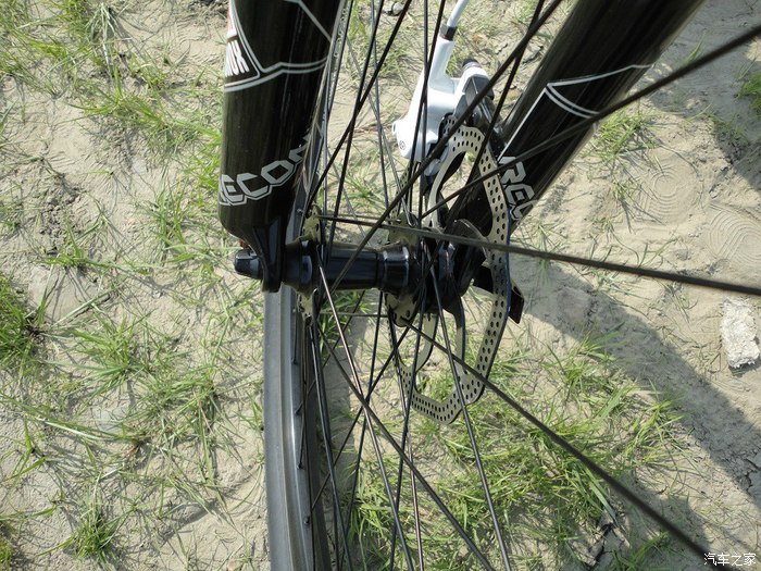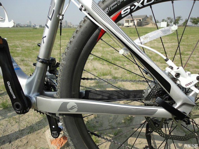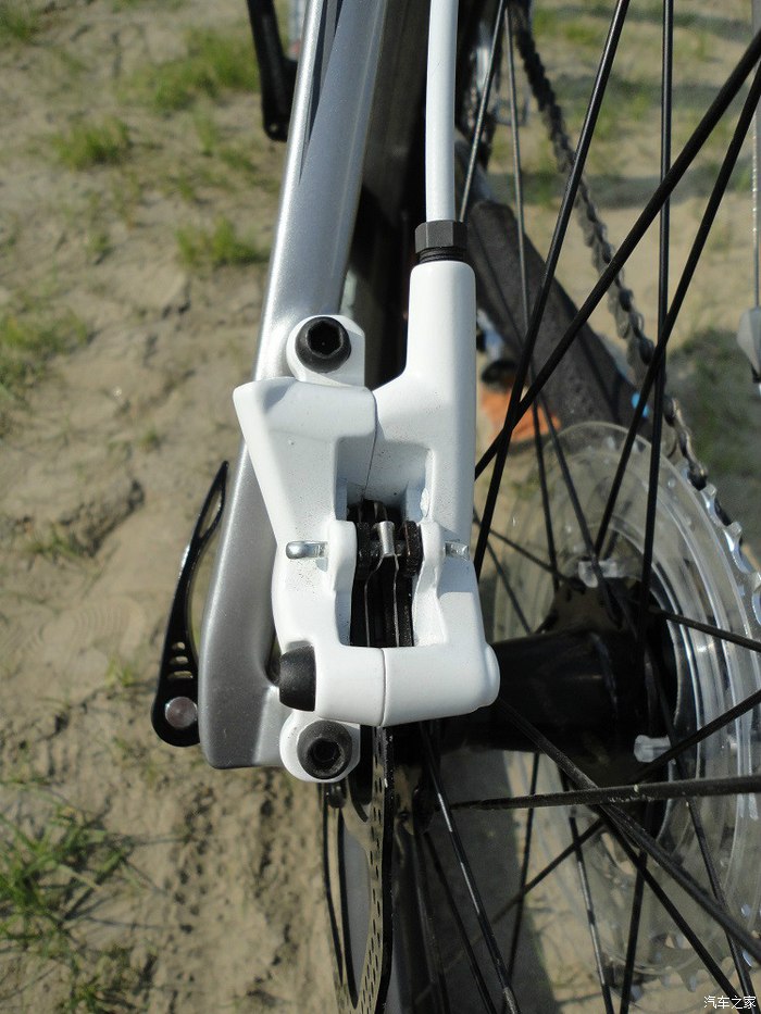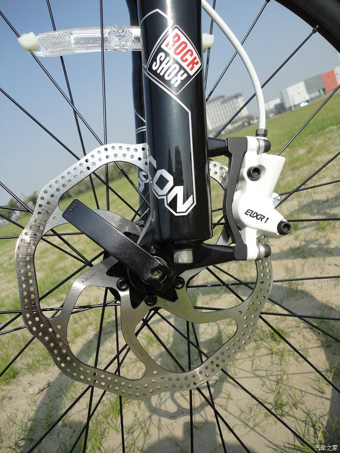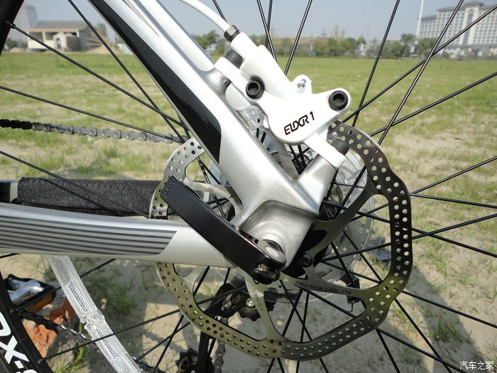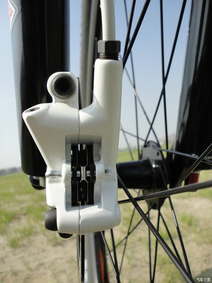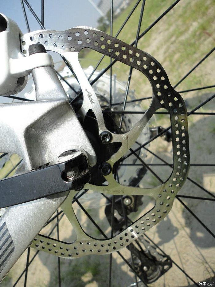 前碟部分,原厂增加了转接座,所以碟片尺寸要比后碟大,180MM的,能够产生更强大的制动力,跟汽车一个道理,山地车的主制动也是在前轮,加大尺寸也是比较科学的做法。碟片的强度很好,不管我怎么暴力制动,都不会变形,也就是俗话说的瓢了,自然不会发生蹭碟的问题,只要调好了,基本不用动它